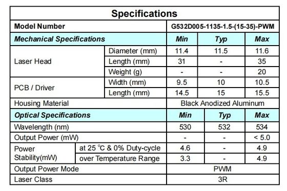 | Longueur d'onde (nanomètre): | 532 | Puissance de sortie (mW): | 5 |